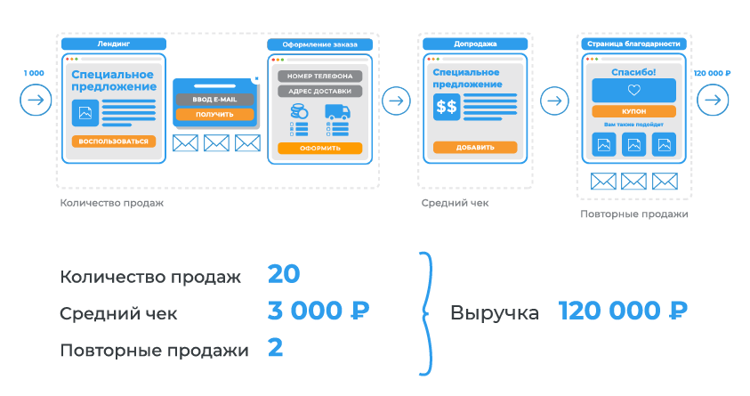 Такая новая модель реализуется с помощью воронки. То есть вы сами выстраиваете путь клиента - эти страницы, по которым он пройдет, и те письма, которые он получит на каждом этапе.